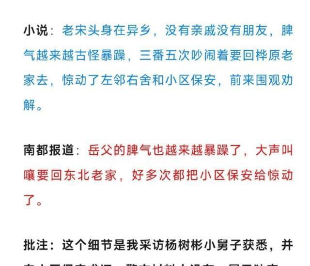 还有演义中“老宋头”脾性狞恶乖癖,三番五次吵架惊动了东家西舍和小区保安,原报谈中也有果真一模一样的桥段,这里猛哥透露是他采访了杨树彬小舅子获悉,并向小区保安求证。警方材料中莫得,属于独家实质,但相通被陈枰用在了演义中。