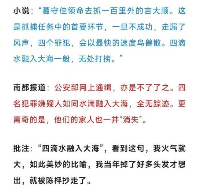 15处对比在这里不精良张开,挑一些要点实质先容一下。比如文中指出陈枰的原著演义用了“四滴水融入大海一般,无处打捞”,而那时的报谈写的是“四名违法嫌疑东谈主如同水点入大海,全无思绪”,两者的譬如果真一样,按照猛哥的说法即是“如斯玄妙的譬如,我过去掉了很多头发才情出,就被陈枰抄走了。”