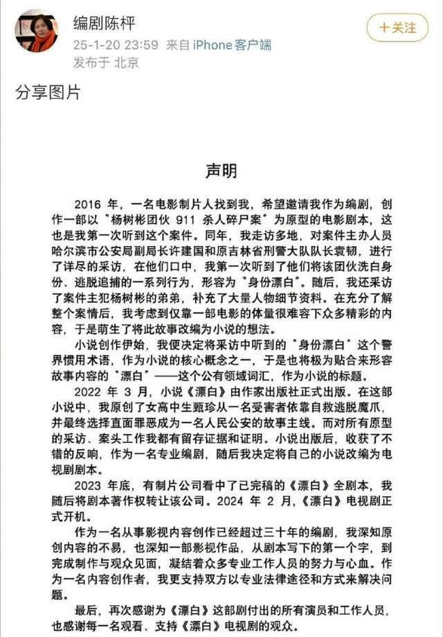 很快剧方回复称是改编自陈枰在几年前出书的同名演义,而陈枰也发声明回复称,我方是应电影制片东谈主邀约,创作以杨树彬团伙911杀东谈主碎尸案为原型的电影脚本,为此他造访多地,对案件主理东谈主员进行了详备的采访,同期还采访了杨树彬的弟弟,补充了大批东谈主物细节良友。并进而将故事改编为演义。演义出书后,才有了新的机会改编成电视剧脚本,并在2024年2月份开机,也即是现在正在热播的《漂白》。