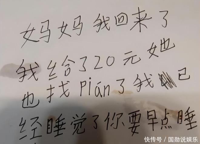 纸条上歪七扭八的笔迹写着“姆妈我回来了,我依然休眠了,你要早点休眠”,还有不注重滴落的水渍,都让东说念主感受到女儿对姆妈的爱。
