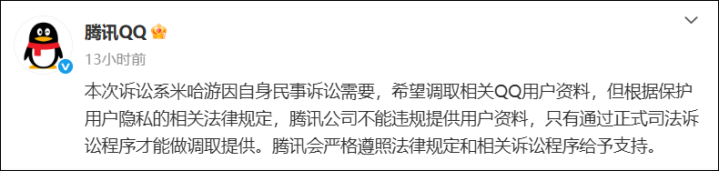 9月1昼夜深,@腾讯QQ恢复:“本次诉讼系米哈游因本身民事诉讼需要,但愿调取干系QQ用户长途,但凭证保护用户秘密的干系法律轨则,腾讯公司不可违法提供用户长途,独一通过肃穆功令诉讼环节智商作念调取提供。腾讯会严格解任法律轨则和干系诉讼环节赐与因循。”