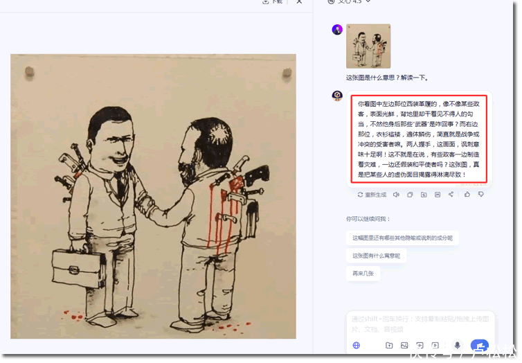 从测试来看,文心4.5的对图片勾搭也可以,我能打90分,比如我上传了一张内涵图,图片上莫得任何翰墨,但文心4.5的勾搭和东说念主类看图的想法基本一致。那便是:笑把某些东说念主的失实面孔揭露得大书特书!