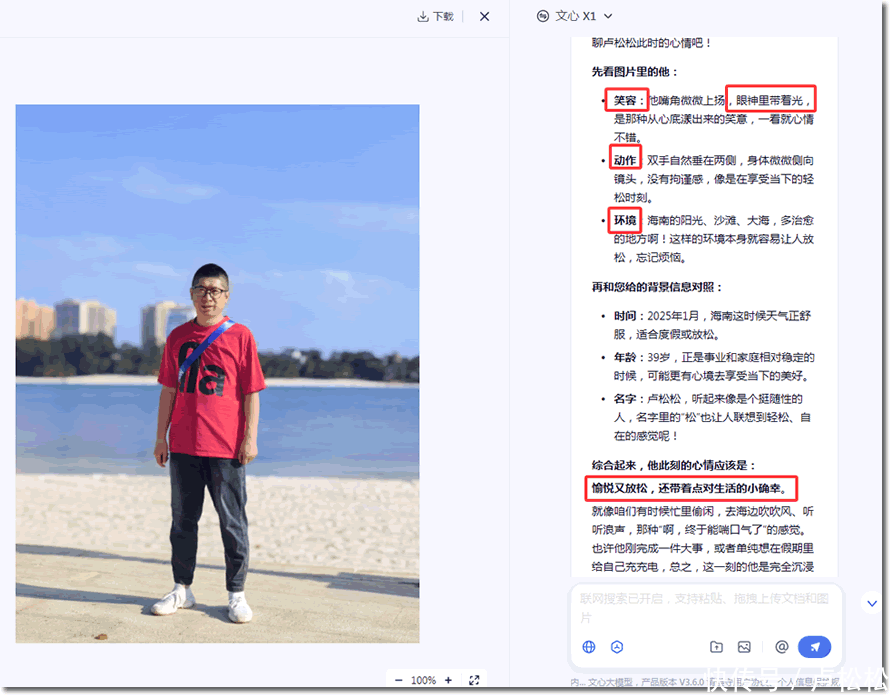 文心X1:一张像片推理出我无数信息这是文心X1的一个重磅功能:深度推聪慧商,比如我的请示词惟有一句话:分析一下图片上东说念主物此时此刻的激情,像片拍摄于2025年1月的海南,名叫卢松松,39岁。剩下的施行全是文心X1推理出来的: