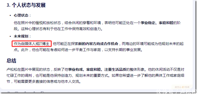 这不是要点,要点是它重大的推聪慧商。文心X1凭证我的穿戴、处所和联网搜索,它果然能判断我是一个业绩有成、家庭和顺、谛视生存品性的东说念主。